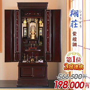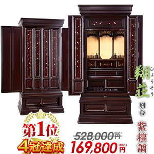 唐木仏壇【翔荘 紫檀調 別台 18×43号】 商品説明 別台仏壇として設計された、伝統スタイルの格式あるお仏壇 日本の古き良き伝統様式を取り入れつつも、和洋室どちらにも馴染みやすいデザイン別台ですが床に置くのはもちろん地袋にも最適