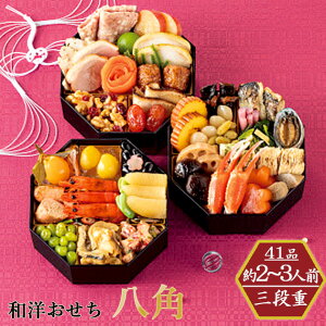 ■縁起の良い八角重に盛り込んだ子供から大人まで楽しめる和洋折衷おせち。 【商品内容】 ●お重サイズ=約15×15×4.6(三段14.9)cm ●約2〜3人前 ●41品 ●重箱盛付済商品 ●樹脂製重箱入[賞味期限:冷凍保存2026年1月...