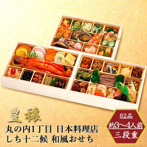 ■東京の玄関口「東京ステーションホテル」内の日本料理店≪しち十二候≫ 日本を代表する和の料理人 齋藤章雄 監修おせち 【商品内容】 ●お重サイズ=約19.5×25.7×5.3(三段18.5)cm ●重箱盛付済商品 ●特製白木重箱入[賞味期限