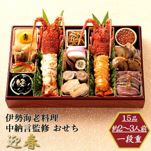 ■伊勢海老料理 中納言監修 おせち 迎春 一段重 (15品/2〜3人前) 商品内容 ■一の重 15品目:伊勢海老柚子マヨネーズ焼、伊勢海老オーロラソース焼、栗きんとん、鯛南蛮漬、黒豆、数の子松前漬、京かまぼこ、蛸旨煮、穴子八幡巻。