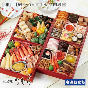 名称 京菜味のむら おせち雅 内容量 四段計45品 サイズ 約178mm×178mm×高さ46mm 約4-5人前(四段) 特製紙重箱 冷凍保存 冷蔵庫(10℃以下)で約17時間解凍。