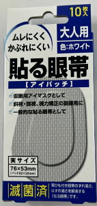【商品説明】 ・ 貼るだけで簡単に装着できしっかりケアする眼帯です。 ・ 眉毛につきにくい設計です。 ・ 肌にやさしい粘着剤(エマルションテクノロジー)を使用しています。 ・ 「低刺激性」、「固定力」、「通気性」、「環境適正」に優
