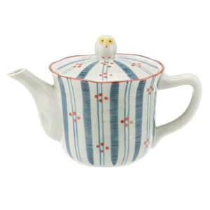 十草柄に点々と花柄を乗せたデザインのポット。 蓋のつまみは可愛らしいフクロウになっています。 独特な形状の持ち手が手にフィットして持ちやすく、約470mlの大容量で普段使いから来客時まで多様にお使いいただけます。 絵柄は職人が