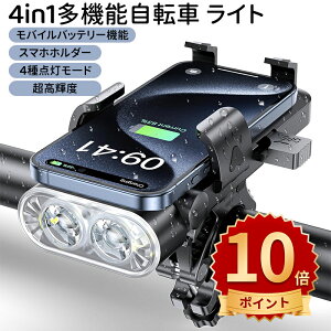 【4in1多機能小型軽量】最新のユニークなデザイン、超高輝度LED自転車 ライト、スマホホルダー、モバイルバッテリーという大人気機能を統合しています。スマホ落下の不安を完全に解消できる 自転車ライト です...