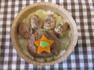コンスターチを使っています。スキムミルクとさつま芋入りのマッシュポテトの上に足跡風に仕上げています。ハンバーグは約55g ●下ごしらえから 箱詰めに至るまで 貴方の大切なワンちゃんの