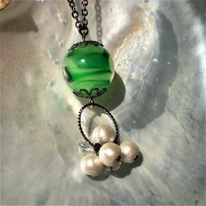 大人気のほたる玉から軽やかにビーズが揺れる、楽し気なネックレスができました。 存在感ある直径約16mmのホタルガラスと、大阪産コットンパールをコラボさせました。 「コットンパールって可愛い、、、いつか自分の作品でも使いたいな