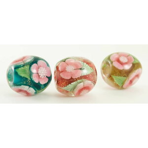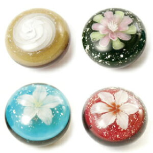 ランプワークという技法により作られたラウンドガラスビーズ。 クリアガラスの中に和風の落ち着いた色味かつ華やかな花柄☆ 時々混じっている気泡が水中花を思わせる涼やかなとんぼ玉です。 一粒でも存在感抜群、根付けやかんざし...
