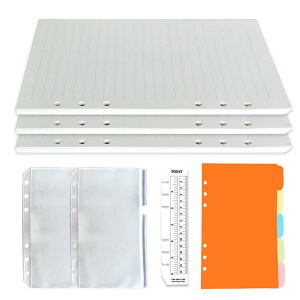 パッケージ内容:6穴A6手帳リフィル3冊×45枚+ファスナーポケット×2枚+カラーインデックス*5枚+しおり定規×1枚。【書きやすい横罫システム手帳リフィル135枚】