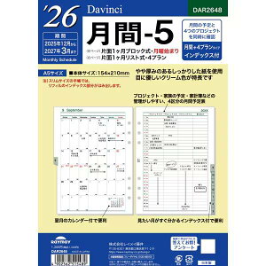 ダヴィンチシリーズのシステム手帳用リフィル 【サイズ】A5【リフィルサイズ】154×210mm 【掲載期間】月間:2024年12月〜2026年3月 【レイアウト】見開き両面1ヶ月ブロック式インデックス付き:見た...
