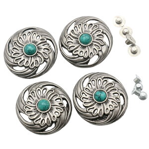ビンテージ調の足つきターコイズコンチョボタンです。ネイティブ系のウェスタンフラワーの装飾ボタンです。材質:合金 コンチョのサイズ:直径約30mm 個数:12個カラー:シルバー仕上げ(ターコイズブルー)丸カンの足つきボタン。