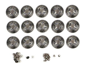 レザークラフトアンティークスターネジ式28mmコンチョ セット内容:コンチョx15個、ネジx30本 サイズ:本体/直径28mmネジ/M3x3mmヘッド大直径7mm小直径5適合ジャンパーホック:15mm...