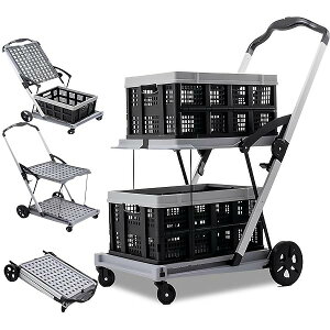 【送料無料】台車 静音 ショッピングカート 折り畳み 2段 2つのコンテナ付 キャリーカート 耐荷重90kg 買い物 キャリー 折りたたみ 新生活 軽量 台車 コンパクト TPR輪・コンパクト収納可能...