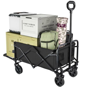 「大型買い物・アウトドア用品の運搬に最適!」 キャリーワゴンはしっかりとしたスチールフレームに加え、100kgの耐荷重が実現できます。120L大容量でたくさんの荷物も1度で運ぶことができます。「全地形対応の超ワイドタイヤ」360度回転