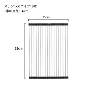 シンクに渡して水を切ることができるラックです。本体はステンレス製で錆びにくいため水まわりに適します。伸縮させることができ、シンクの幅に合わせて調節できます。フチはシリコン製のため滑りにくくシンクのフチにフィットします。使わないときは巻...