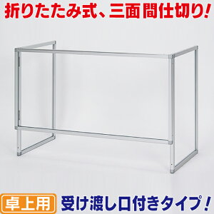 飛沫感染防止対策の、折りたたみ式卓上間仕切り! 1台で、3方向をカバー! ●折りたたむことができる三面自立型。 ●フレーム付きでしっかりした作りになっています。 ●受け渡し口付きタイプ。 ●カウンター受付や...