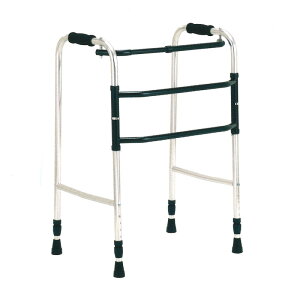 交互歩行器(折り畳み型) 歩行器とは、歩行機能回復を目的とした訓練機器であり、日常生活に於ける歩行補助機器として用いられるものをいいます。 歩行器には、肘で保持するもの、グリップで保持するものなど用途によって様々なもの