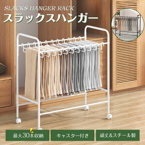 【商品名】スラックスハンガーラック【特長】・出し入れしやすいラックタイプのスラックスハンガー・キャスター付きで移動も楽々・20本のハンガーでたっぷり収納・ハンガーは1本ずつ取り外せるから出し入れ簡単・デッドスペースを有効