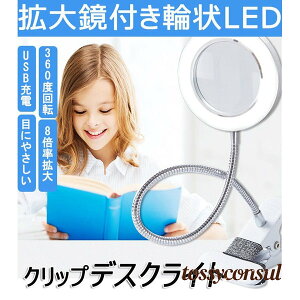 【金属材-360度回転】アームとクリップ部分は高品質な金属で、より長寿命、耐久性もよい。グースネックは360度調整しやすい。デスク/ピアノ/譜面台/本棚/ベッドなどのいろいろなところに使用できる。【8倍の倍率-目に優しい】このデスクラ