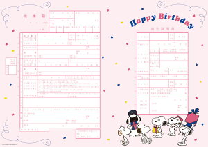 「Happy Birthday!」 きょうだいから誕生日プレゼントをたくさんもらって、幸せそうなスヌーピーを描いた出生届です。 淡いピンクを基調としたシンプルなデザインなので、お部屋に飾っても長い間お楽しみいただけます。 出生届製作所の出生