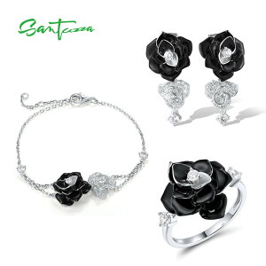 スターリング シルバー ジュエリー セット レディース エナメル ブラック 黒 ホワイト 白 花 フラワー ブレスレット ピアス リング 指輪