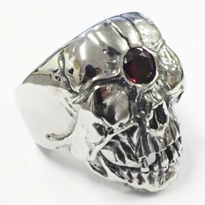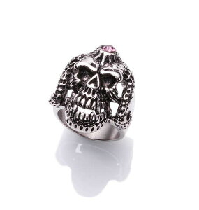 不気味なデザインのスカルに赤色のジルコニアをセットしたステンレスリング。額にもジュエルがセットされています。丈夫で半永久的な輝きを見せてくれる高級感のあるステンレスリングは、毎日の普段使いから、フォーマルなパーティー