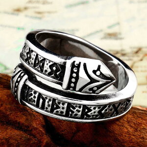 海賊の武器をモチーフにしたおしゃれなフリーサイズのステンレスリング。アーム部分に壁画のようなも文字をデザインしたバイキングリング。 素材も安心のサージカルステンレス316L製で高級感も存在感も文句なし。 メンズでもレディース