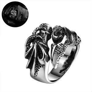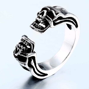 両側から2人の髑髏にはさまれたサージカルステンレス316L製の指輪。不気味な骸骨が存在感を発揮してくれるステンリングはメンズでもレディースでも使えるハード系モチーフ。サイズもフリーサイズのスカルリングは...