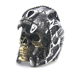 頭に動物の頭蓋骨を被り羽飾りを付けた金色の毒ををデザインした不気味なステンレスリング。 重厚感たっぷりの存在感のあるごつい指輪です。 男性からも女性からも人気のステンレスリングは、ペアリングにも最適です。素材も安心のサ