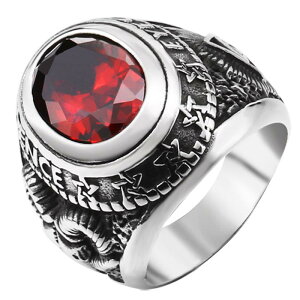 トップに楕円形の赤色のキュービックジルコニアをセットした印台型のチャンピオンリングのような指輪。 印台型の片側には悪魔やデビルサタンをイメージさせる山羊のデザイン、もう片側には三角形のトライアングルのピラミッドの中に不