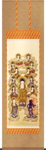 【画 題】浄土十三佛 【解 説】阿弥陀如来を中心に、西方浄土の地よりあらわれになった十三の仏様を、精緻な筆致と豪華端麗な彩色で描き上げた、仏事必携の代表的仏画作品です。 【寸 法】190cm×54.5cm(尺五立) 【作 家】森山観月 【特