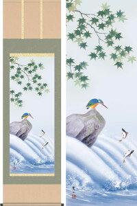 【画 題】鮎にかわせみ 【解 説】早瀬を遡ろうとする香魚の群れを狙う一羽のかわせみ。清涼感あふれる一景の中に、自然の営みの厳しさまで描きこまれた清々しい作品です。 【寸 法】190cm×54.5cm(尺五) 【作 家】唐沢碧山 【体 裁】表