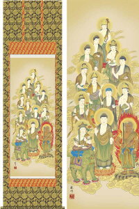 【画 題】十三佛 【解 説】荘厳な仏事の深奥にある悠久なる伝統の心。作者の画境は仏徳の真髄に至り、秀麗なご尊顔繊細な指先の一本一本までも精緻巧妙に描き上げました。 【寸 法】190cm×54.5cm(尺五) 【作 家】山村観峰 【体 裁】表