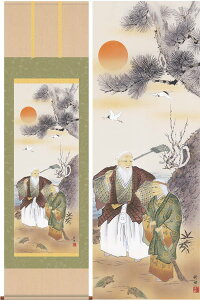 【画 題】高砂 【解 説】高砂やと詩吟にも謳われる故事にならい、中国古来の由緒ある不老長寿の題材を一堂に描きました。末永い長寿円満を祈念し縁事を厳かに演出します。 【寸 法】190cm×54.5cm(尺五) 【作 家】田村竹世 【体 裁】表