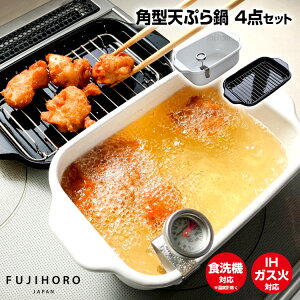 富士ホーロー 天ぷら鍋 角型 IH対応 温度計 揚げ網 バット付き 394805の解説 ●大きめのフライも少ない油でカラっと揚がる(適正油量:約600g)。 ●使い勝手のいい大きさ。重ねてコンパクトに収納可能なので省スペース...