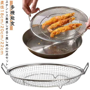 手提げあり)+皿 ●サイズ:18/20/22cm,素材:ステンレス鋼 ●蒸しかごとしての利用だけでなく、揚げ物かごや多機食器としても使用可能 ●ステンレスフライパンと組み合わせることで、手軽に蒸