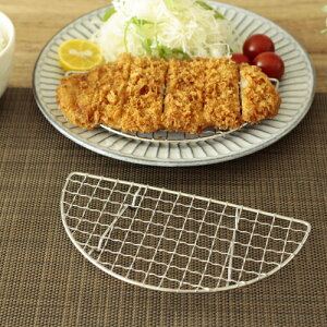 とんかつ用の半月型金網です。 皿の中央側に脚が付いています。 沿え野菜にドレッシングをかけても、揚げ物につくことなくおいしく召し上がっていただけます。 お皿のサイズに合わせてお選びくださ