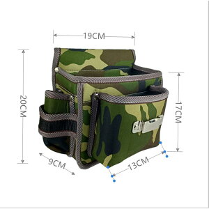 ・カテゴリ: 工具用エプロン・種類: カラフル小型バッグ(ベルト付き)、迷彩柄底補強ツールバッグ、青縁スチールフックタイプ、大型迷彩バッグ