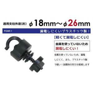 プラスチック製で、軽くて作業効率がいい。 ●手でナット部分をまわせるので、工具が必要ありません。 ●支柱の太さ18〜26mmに対応し、菜園の侵入防止や防獣用の