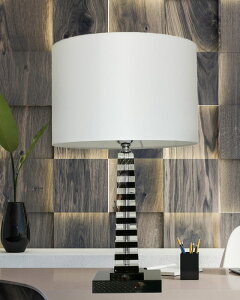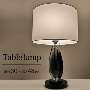 ホワイトの高級布で出来たシェードとクリスタルの支柱、そして黒の飾りがアクセントが効いていて、大変印象的なオブジェのようなテーブルランプです。 目を引くのが、支柱のアクセントとなっている黒のオーナメントです。円形のアクセ