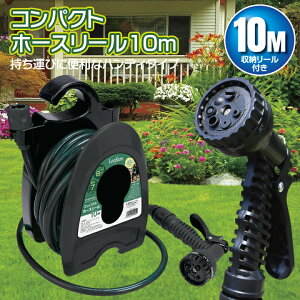 コンパクトリールホース10m ・水やりから洗浄まで出来る万能ホース!! ・7種類の便利な噴射切り替え付き ・水やり、洗車、掃除などに最適なコンパクトリールホースです。 ・ガラス窓や壁面、玄関先や車など大掃除でも大活躍。 ・使用する