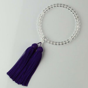 手にした時のヒヤッとする感触は天然石の証。末永くお使い頂ける女性用数珠(京念珠)です。 9×6mmサイズの主玉を使用した、標準的な大きさのお数珠。 房には、水晶の輝きにそっと色を添える、紫の正絹散華房を使用しており...