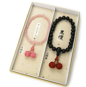 念珠堂 日本製 数珠セット 黒檀 イーグルアイ 二天入 (房色 鉄紺) 男性用/紅水晶 ローズクォーツ (房色 珊瑚) 女性用 【 携帯用 数珠ケース付 】 数珠 正絹小田巻梵天房 全ての宗派でお使い頂