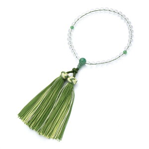 女性用の略式数珠です。透明水晶を基本に、2天玉には翡翠(アベン)を配してあります。房は正絹の花かがり房です。 黒い背景は電球照明、白い背景は蛍光灯照明での撮影です。 この数珠は外国で完成状...
