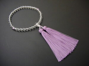 女性用の略式数珠です。透明水晶を基本に、2天玉には藤雲石を配してあります。房は正絹の花かがり房です。 黒い背景は電球照明、白い背景は蛍光灯照明での撮影です。 この数珠は外国で完成状態まで仕上げてから輸入することで...