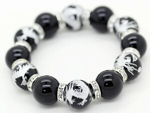 彫刻オニキスと水晶などの天然石ブレスレットです。 2つの16mmオニキスには、それぞれ金彫りと銀彫りの五爪龍が彫刻されています。 内周は約18cmなので、男性がゆったりと着けられます。 【オニキス】 邪念ま