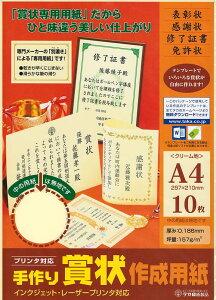 賞状用紙 手作り賞状作成用紙 A4 クリーム 10枚入り タカ印 10-1967 〇インクジェット・レーザープリンタ対応 〇サイズ:A4(297mmx210mm) 〇材質:ケント紙 〇厚み:0.186mm...