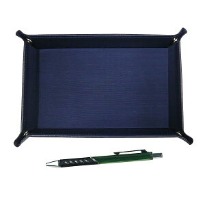 日本製のシボ牛革ペントレイと金属製ボールペン(緑軸)のセット ペントレイ(青) 材質:内側布貼り、外側牛革 サイズ:185mm×125mm×30mm ペン 材質:アルミ サイズ:全長134mm×軸径9mm