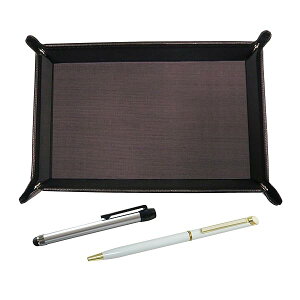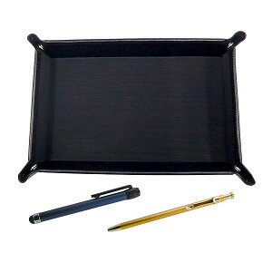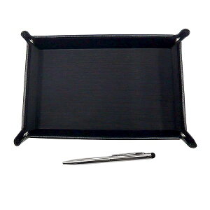 日本製のシボ牛革ペントレイと日本製スマートフォン用タッチペンとボールペン(銀軸)のセット ペントレイ(黒) 材質:内側布貼り、外側牛革 サイズ:185mm×125mm×30mm タッチペン(銀) 材質:アルミ...
