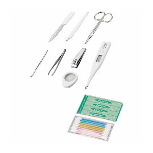 包帯や毛抜きなど、応急手当ての必須用品をまとめた救急セット。取っ手の付いた箱型ケースに入っています商品サイズ (幅×奥行×高さ) :190×125×105mm内容量:コットン球、伸縮ホータイ、綿棒、サージカルテープ・毛ヌキ、ガーゼ、三...