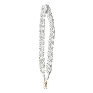 商品説明 マクラメ編み スマホ用ショルダーストラップ 2色の編み込みに花柄コサージュがついたショルダーストラップ スマホやポーチ、バッグなどのストラップとしてご利用可能 太めの平ヒモなので長時間使用しても首や肩が痛くなりに
